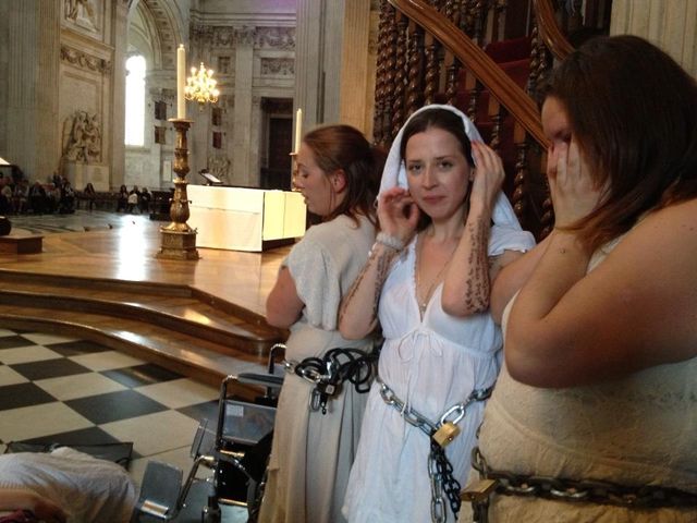 While Christianity Uncut unfurled a 5m x 10m banner outside the Cathedral urging the leadership of St Paul’s to “Throw out the money changers from the temple”, four Occupy activists staged a mic check during Evensong. [1] They are now locked on to the Cathedral pulpit not planning to leave.