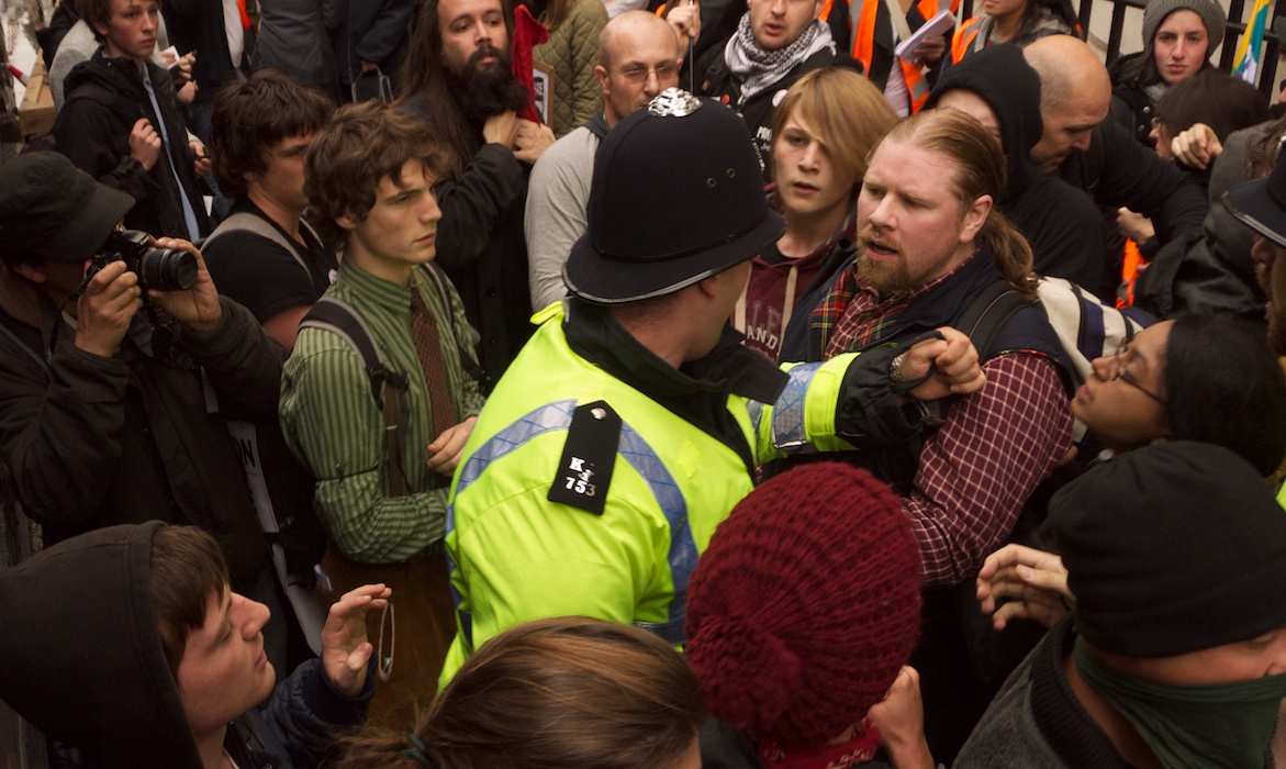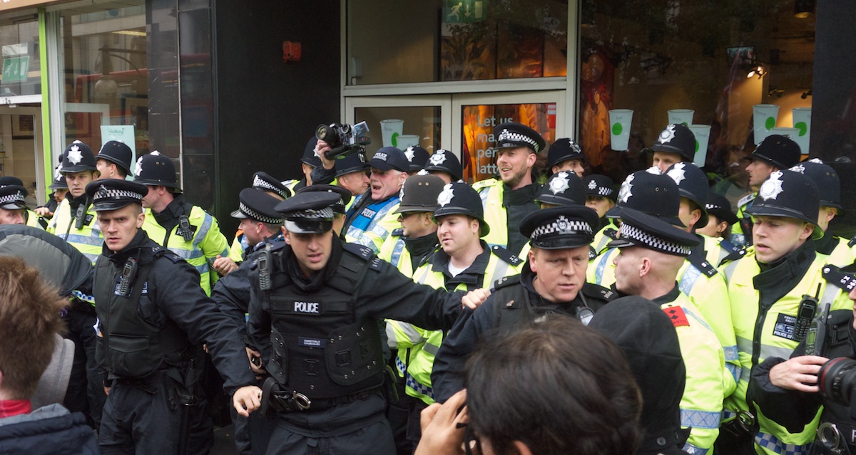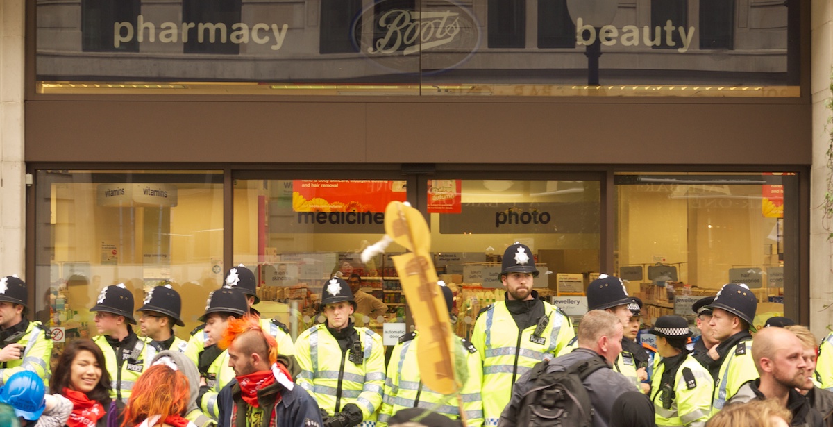 although there was a lot of running about, and many of the protestors were masked up to avoid surveillance, the protests seemed entirely peaceful. even though each shop invasion ended without damage, and with everyone leaving voluntarily, some police were out of control. at primark, i witnessed a young photographer assaulted without cause as he was grabbed by several large cops and bundled out of the shop, grabbed by the neck and pushed hard.