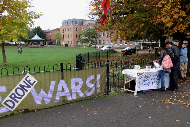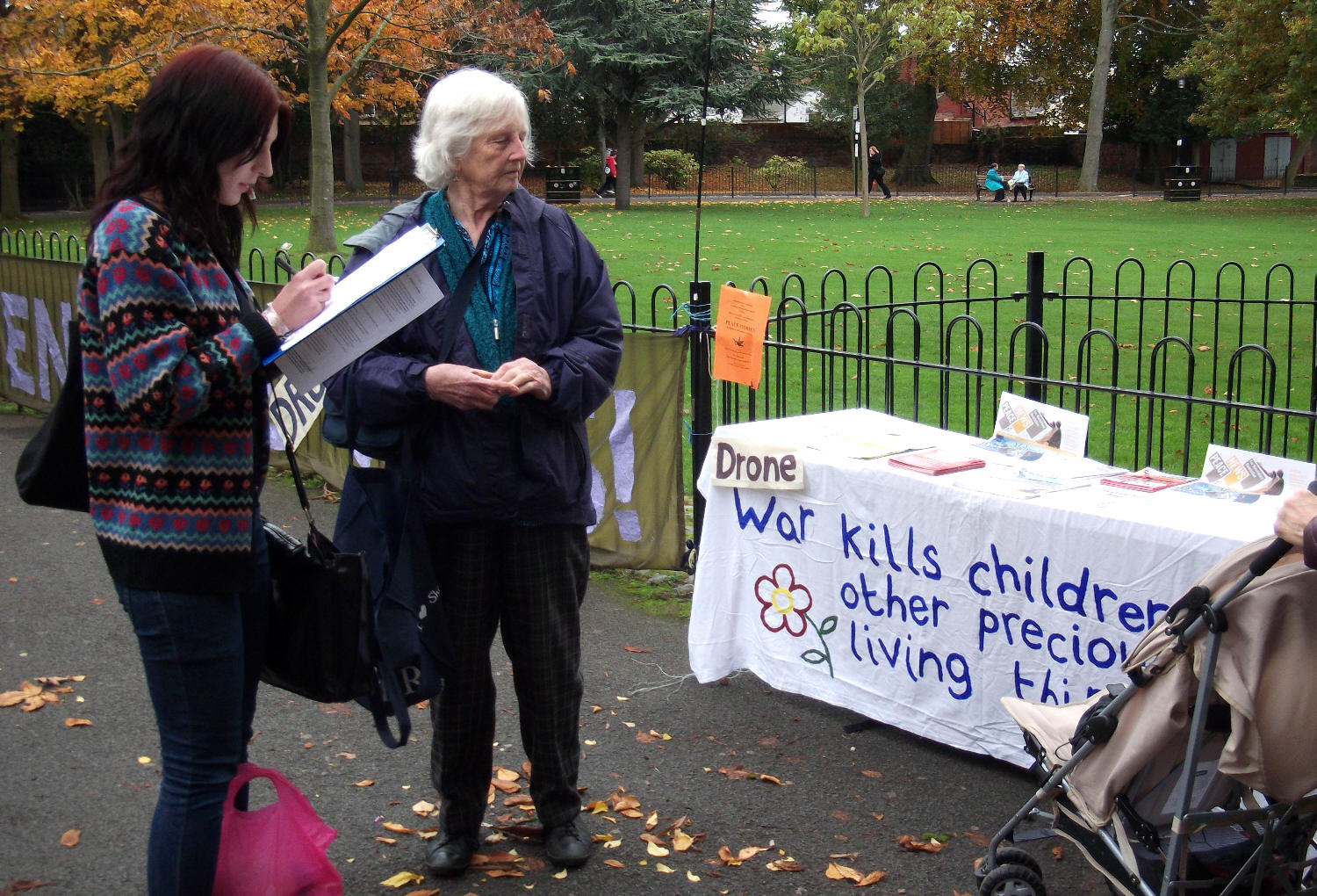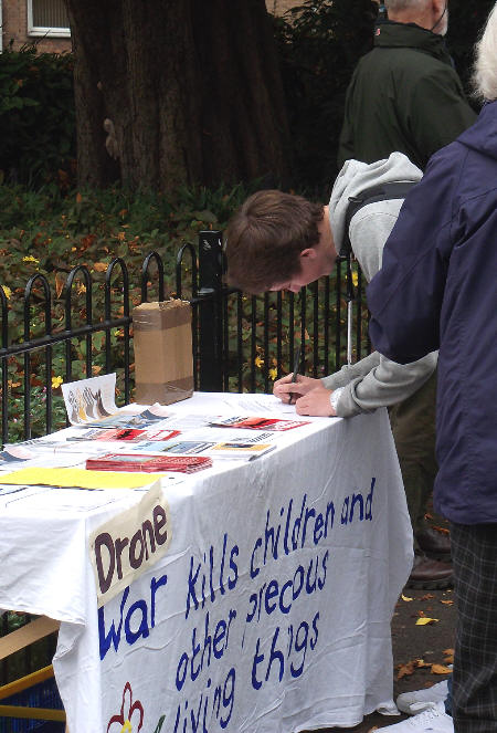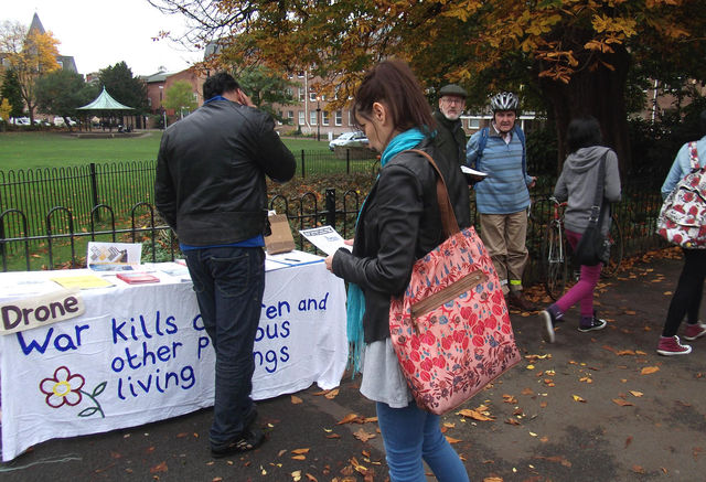Wrexham Peace & Justice Forum held an information stall outside the Library in Wrexham at lunchtime on Thursday 25 October to raise awareness of the issues, particularly the effects of drone attacks on civilian populations [6] and the extreme secrecy around British drone strikes in Afghanistan. In not much more than an hour hundreds of leaflets were distributed and over 50 people signed a petition calling for Britain to 'Lift the Veil on the Drone War' [7].