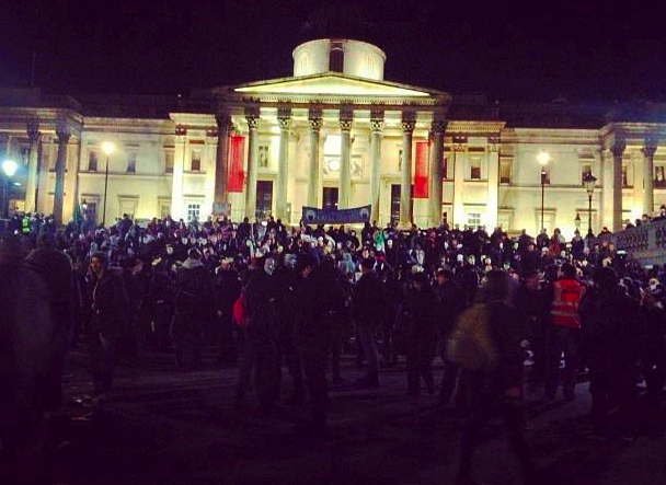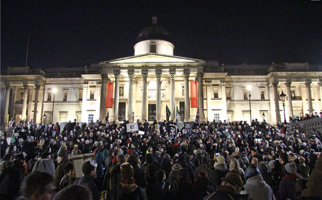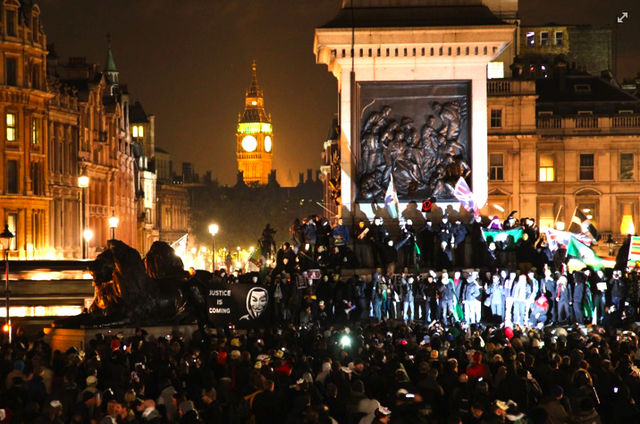 at around 7.30, anons climbed the ledges around the base of nelson's column, and this then became the focus for the crowd, which at its peak might have numbered close to a thousand.