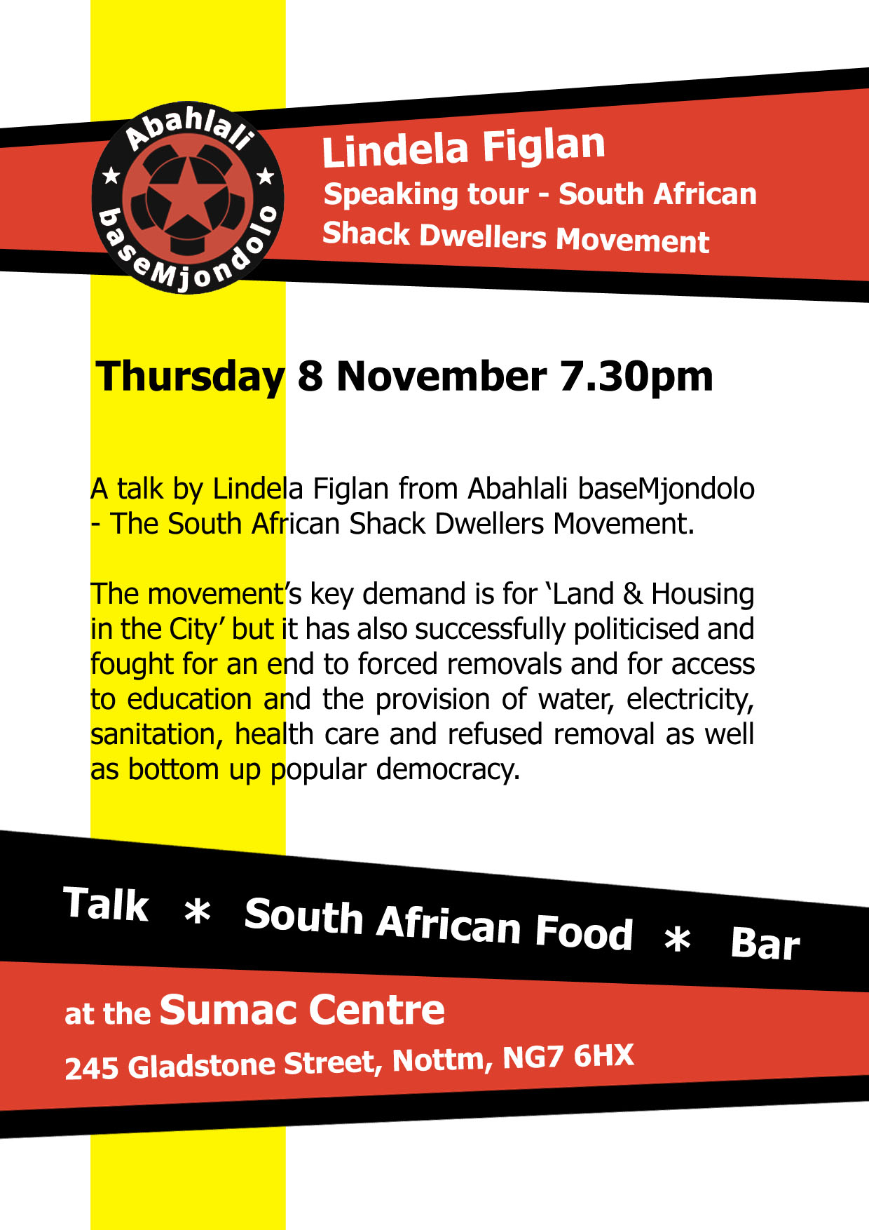 A talk by Lindela Finglan from Abahali baseMjondolo, the South African Shack Dwellers Movement. Thursday 8 November, 7.30pm