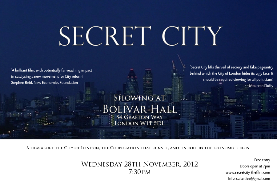 Secret City questions the Corporation’s role through contributions from Londoners, including scholars, an MP, a businessman, Church people and activists. Participants include Lord Glasman, John McDonnell MP, the Revs. William Taylor (Stamford Hill) and Alan Green (Bethnal Green), Natalie Bennett, Malcolm Matson, Occupy activists, and Professors Doreen Massey, Robin Blackburn, Steven Haseler and Clive Bloom.