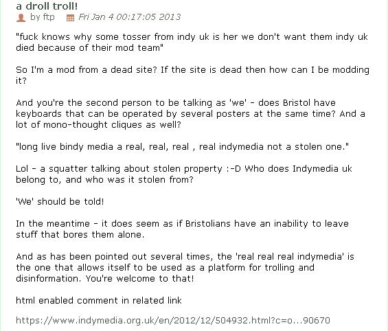 The links show that this trolling has been going on for years. As is now happening all over the shop on Bristol IMC the troll uses different nicks, including pretending to be mods from IMC uk in order to sow FUD