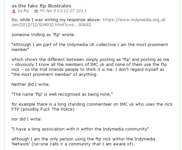 Tis almost as if a troll is writing comments aimed at me - so it can respond to them - eg laughing at the claim, not made by me that "Although I am part of the Indymedia UK collective I am the most prominent member"