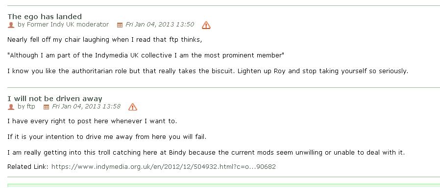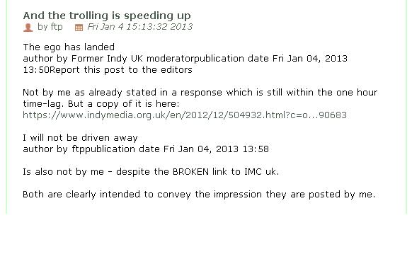 So, it appears that the troll is doing some boundary testing to see what the limits are, whilst at the same time attempting to foster bad relations between BIMC and UK imc - despite it's protestations that it trusts BIMC and not UK, the truth is it doesn't like either site.