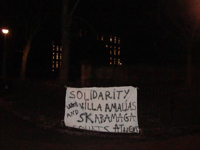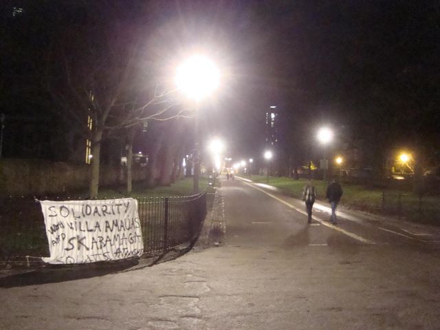 Solidarity banner with Villa Amalias and Skaramaga squats(Athens) at the Meadows in Edinburgh.