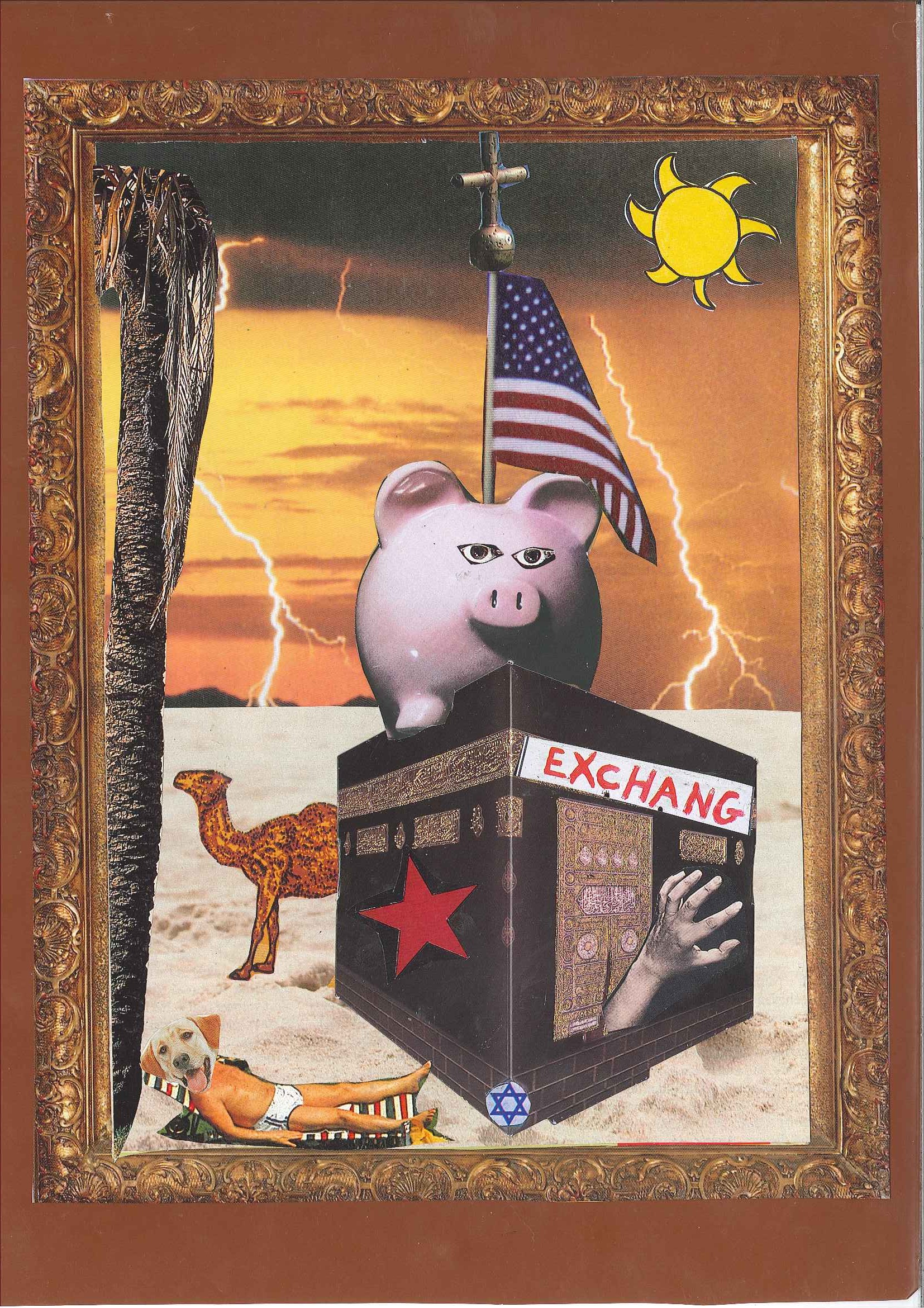When I got home, checking out the latest world news, I noticed a headline that coincided strangely with the story I had just told Ahmet. In England a man had been charged with a public order offense for leaving a pig’s head on the doorstep of a community centre in Leicester, in protest about it being used by a Muslim prayer group. I began to think about my collage. How about a pig on top of the Kaaba? Blasphemy? Depends what you mean by the word. The Kaaba isn’t God. It was a pagan shrine long before Mohammed came along. And besides, I’ve got nothing against God. It’s religious elitism and intolerance that I’m agin.