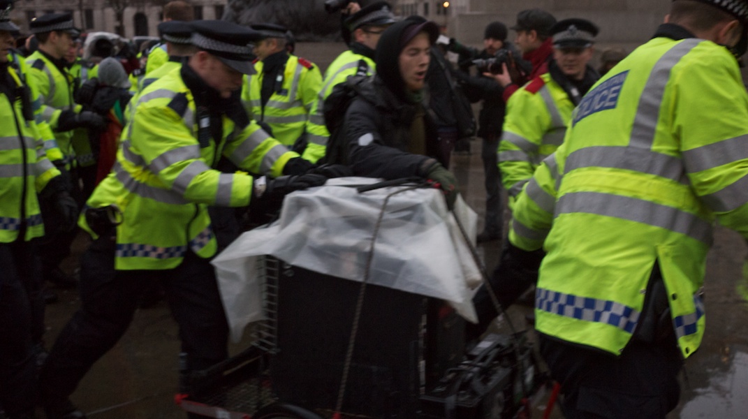 a chief inspector came to the front of the crowd and announced that the line would retreat, finally diffusing the situation. in my opinion, at that point it seemed that the overall police strategy was a strange mixture of a provocative zero tolerance re bye-laws, but no direct attempt to manipulate and provoke the crowd into violence and kettling.