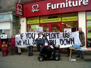 May Day in Edinburgh saw anti workfare demonstrators touring companies and charities using unpaid forced labour. Starting with an excursion into the giant Homebase at St Leonards the protestors from Edinburgh Coalition Against Poverty went on to visit no fewer than 7 exploiting employers.