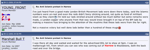 The Daily Mail also claimed that "moments after his speech... some of the crowd hurled bricks and fireworks at the police", without, some more factual inaccuracies notwithstanding, bothering to mention that while police behaviour on the day was mostly commendable, only a tiny number of people threw missiles, and anger at the police had been provoked by the police (rightly or wrongly) protecting a group of far-right thugs who chanted "EDL" and gave Nazi salutes (and to prove the point, Nazis discussed their presence at Harrow on the KKK-founded web forum Stormfront, confirming attendance by thugs from a Nazi group called the British Movement - see image).