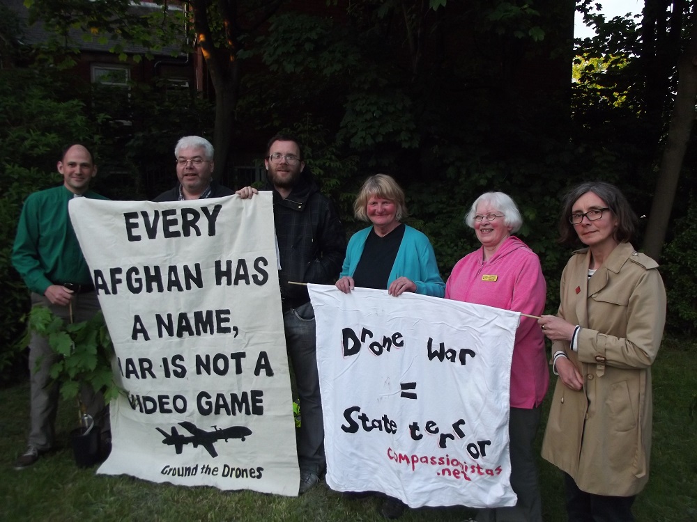 The six individuals, who took in news stories about civilians killed as a result of drone strikes were: Chris Cole (Drones Researcher), Martin Newell (Catholic Priest), Dr Keith Hebden (Anglican Priest), Susan Clarkson (Quaker Pensioner), Henrietta Cullinan (Teacher) and Penny Walker (Grandmother). They all felt moved to act after British Armed Drones (Unmanned Combat Aerial Vehicles) became operational from British soil on the 25th April 2013, and the MoD has since confirmed that British drones controlled from RAF Waddington have made their first kill in Afghanistan.