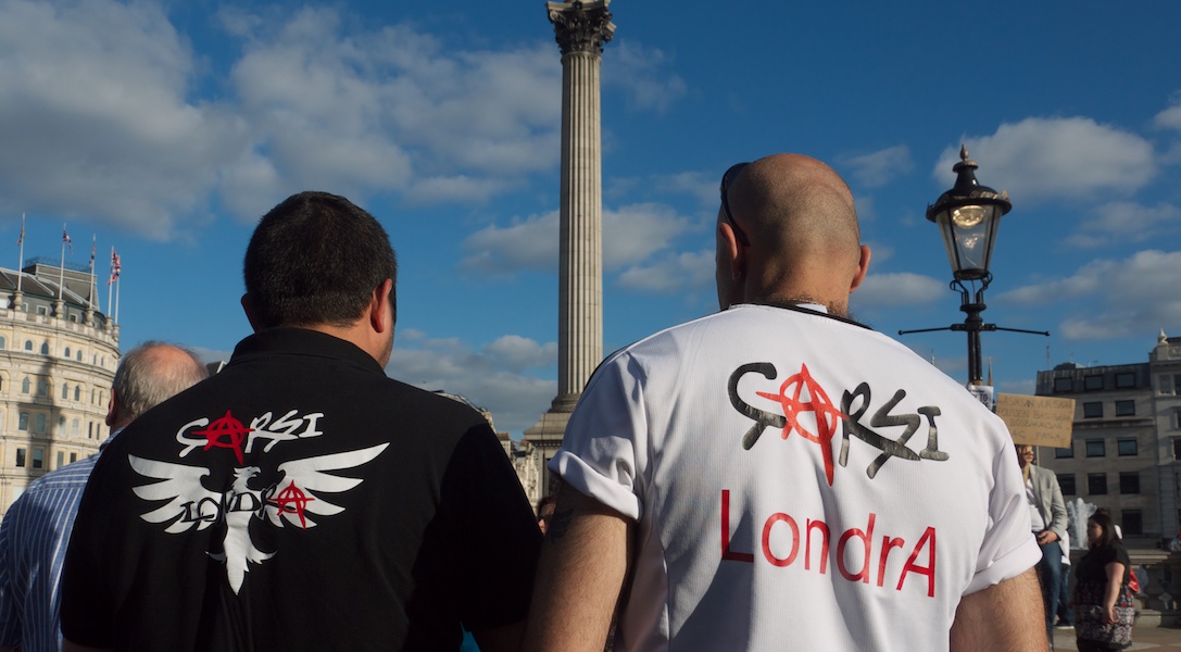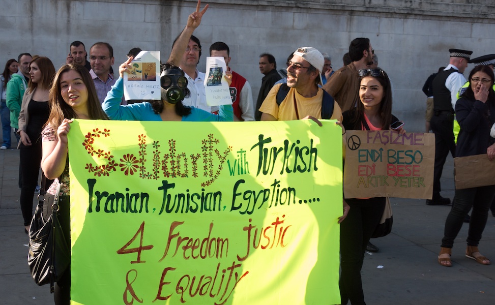 when i arrived in trafalgar square this evening there were still hundreds of mainly young turkish people milling around, some with banners and flags, some with drums and percussion, some dancing, some posing for pics.
