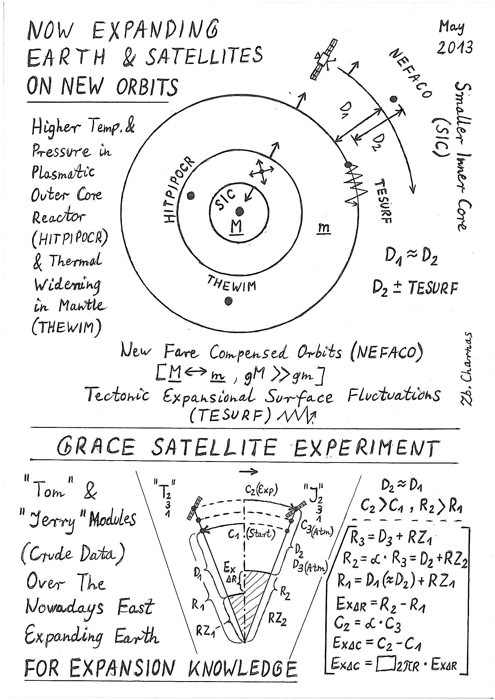 So, just now in the year 2013 there comes maybe one especial chance for our civilisation to estimate how big is the scale of nowadays expansion of the Earth – computing for it some interesting crude (elemental) data taken by still circling now in the near-global cosmic space modern scientific satellites. I think in this moment about Gravity Recovery and Climate Experiment “GRACE” – using “Tom” and “Jerry” racing satellite modules. In this mentioned here mission “Tom” runs after his partner “Jerry”. I ponder also about next comparable expansionistic satellite missions in type: “Tom & Jerry” and “CheeseBox”. The third should be air-elbowing module for “T-J” (‘CB’ – circling as the first of this triad). There can exist other kinds of important very much geonautical satellite projects, too – for instance projects to search how is distributed internal density in expanding Earth.