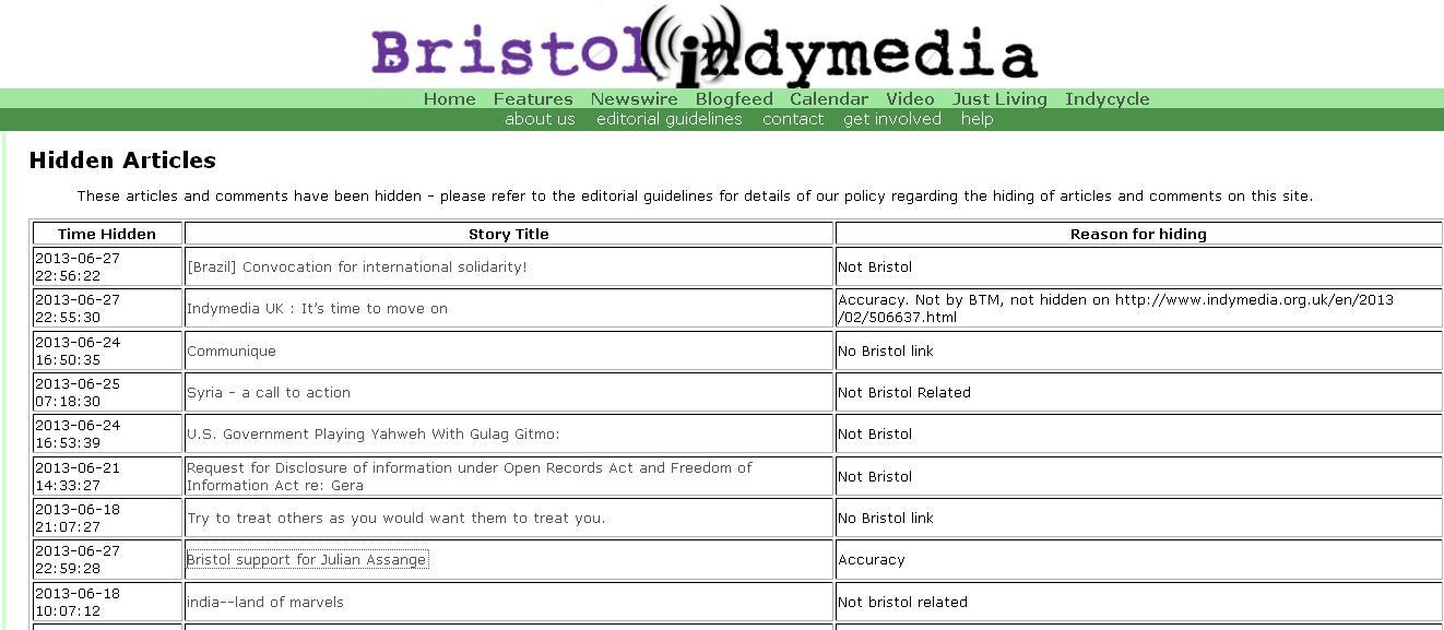 The Indymedia UK : It’s time to move on has now been hidden with the reason given as "Accuracy. Not by BTM, not hidden on http://www.indymedia.org.uk/en/2013/02/506637.html", and the Bristol support for Julian Assange article has also been hidden, with the reason given as "Accuracy"