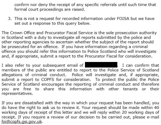 Police Scotland are standing by to investigate reports of crime, and those who have charged illegal tenant fees face fines of a thousand pounds and a criminal record.