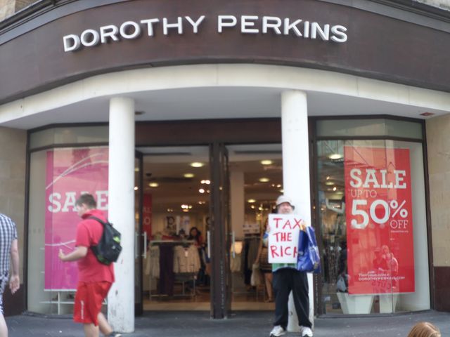 Some photos from Glasgow's "Walk-of-Shame" Thursday 11 July. A group set off down Sauchiehall Street armed with banners and leaflets, stopping outside those shops that milk the governments free slave labour scheme, workfare. They engaged the public and handed out a considerable number of leaflets at the entrance of the shops involved, which were well received by the public. The more the public are made aware of this free slave labour scheme and what it actually means, the more resistance will grow. Here's to more and larger "Walks-of-Shame", until this slave labour scheme bites the dust.
