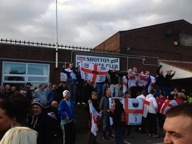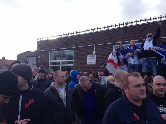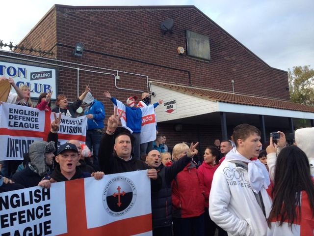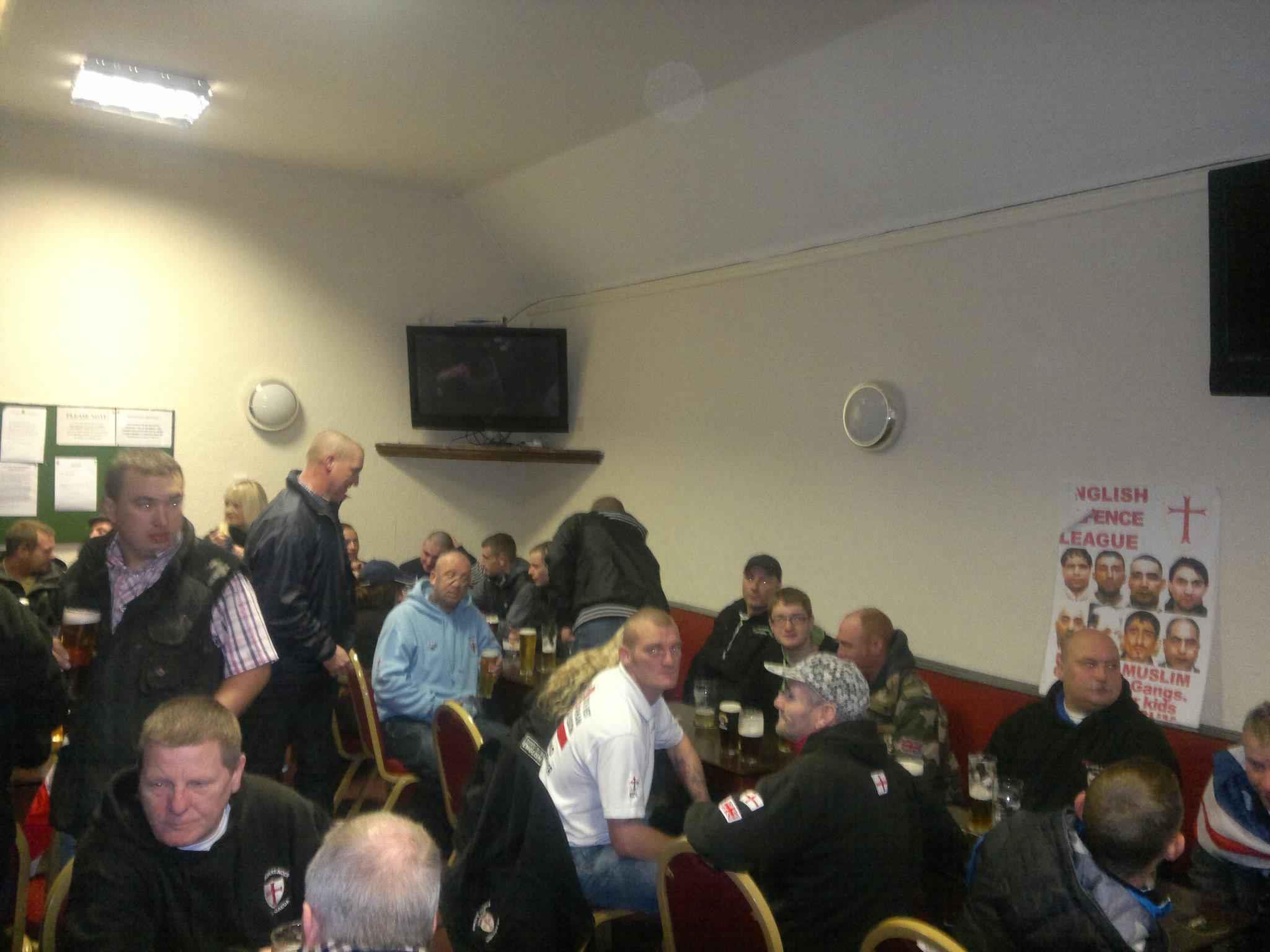 Sunderland EDL members outside pub with person wearing a Skrewdriver T-shirt
