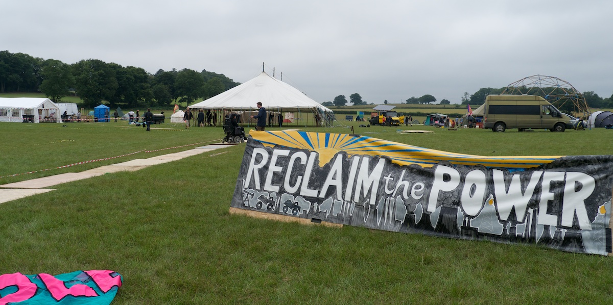 The ‘Reclaim the Power’ site itself is a further two miles along the road, in a field that the organisers have squatted, taking great pains to communicate with the landowner, who, reassured that the field will not be damaged, has agreed not to take any action. I was given an official ‘media tour’ of the camp, which has strict policies on photography.
