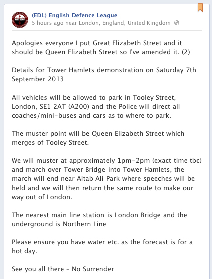 EDL to muster in Tooley Street, then march to Altab Ali Park