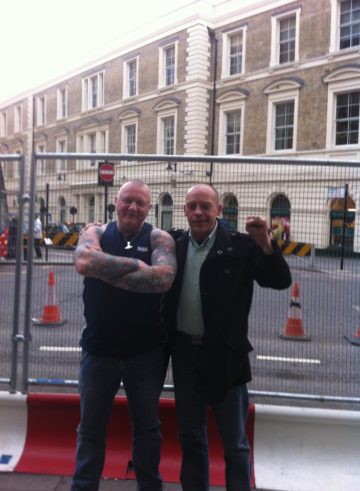 Photo 4 - John "Pizza Face" Smith from the EDL Walthamstow march, giving another Nazi salute, showing the same tattoo on his arm that the bloke in the 1st photo has on his chest, this time saluting alongside a guy who identifies himself as Mick Wakefield from Winchester, who describes himself as "President ATB/C18 UK" (meaning, as per their T-shirts - Aryan Terror Brigade / Combat 18)
