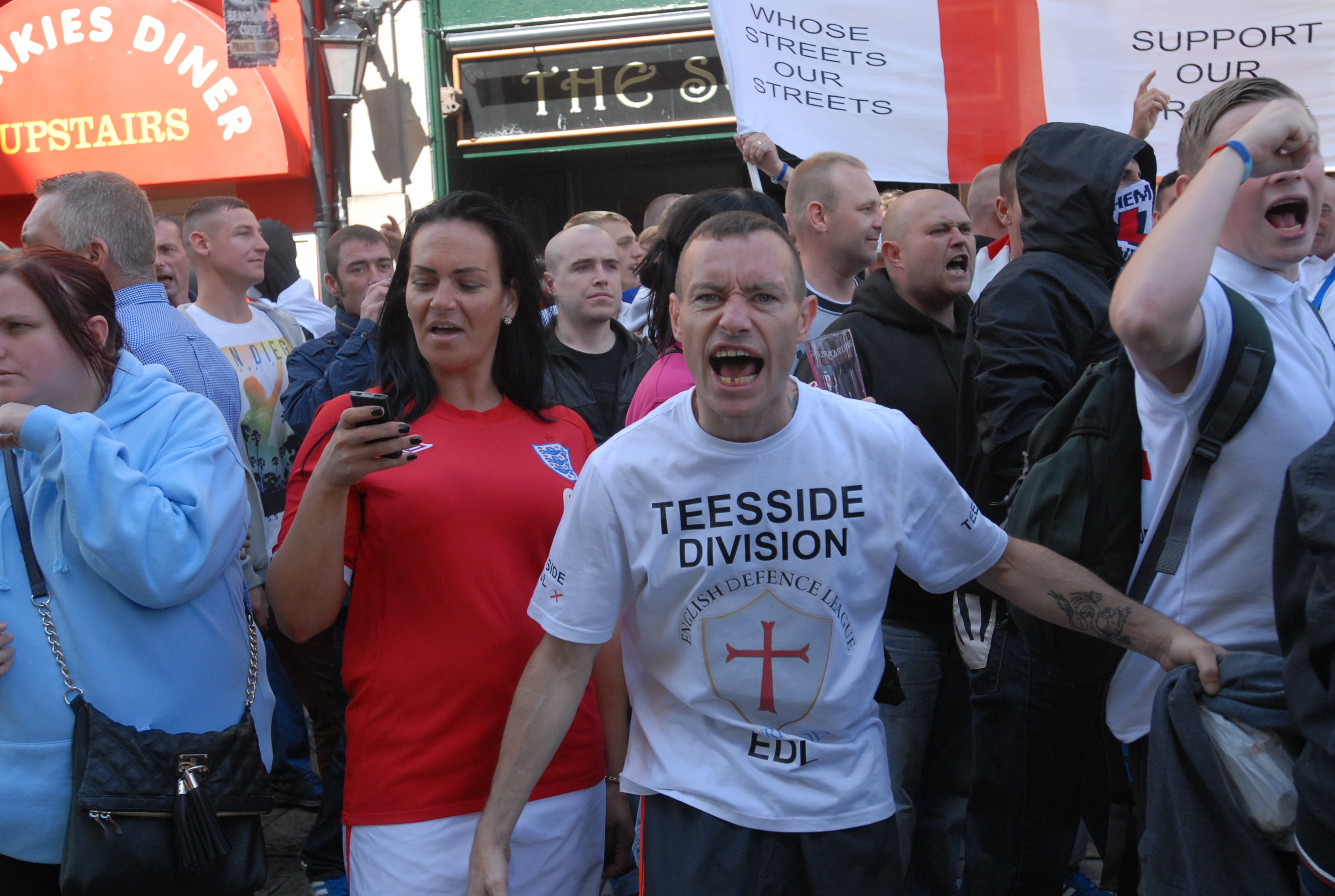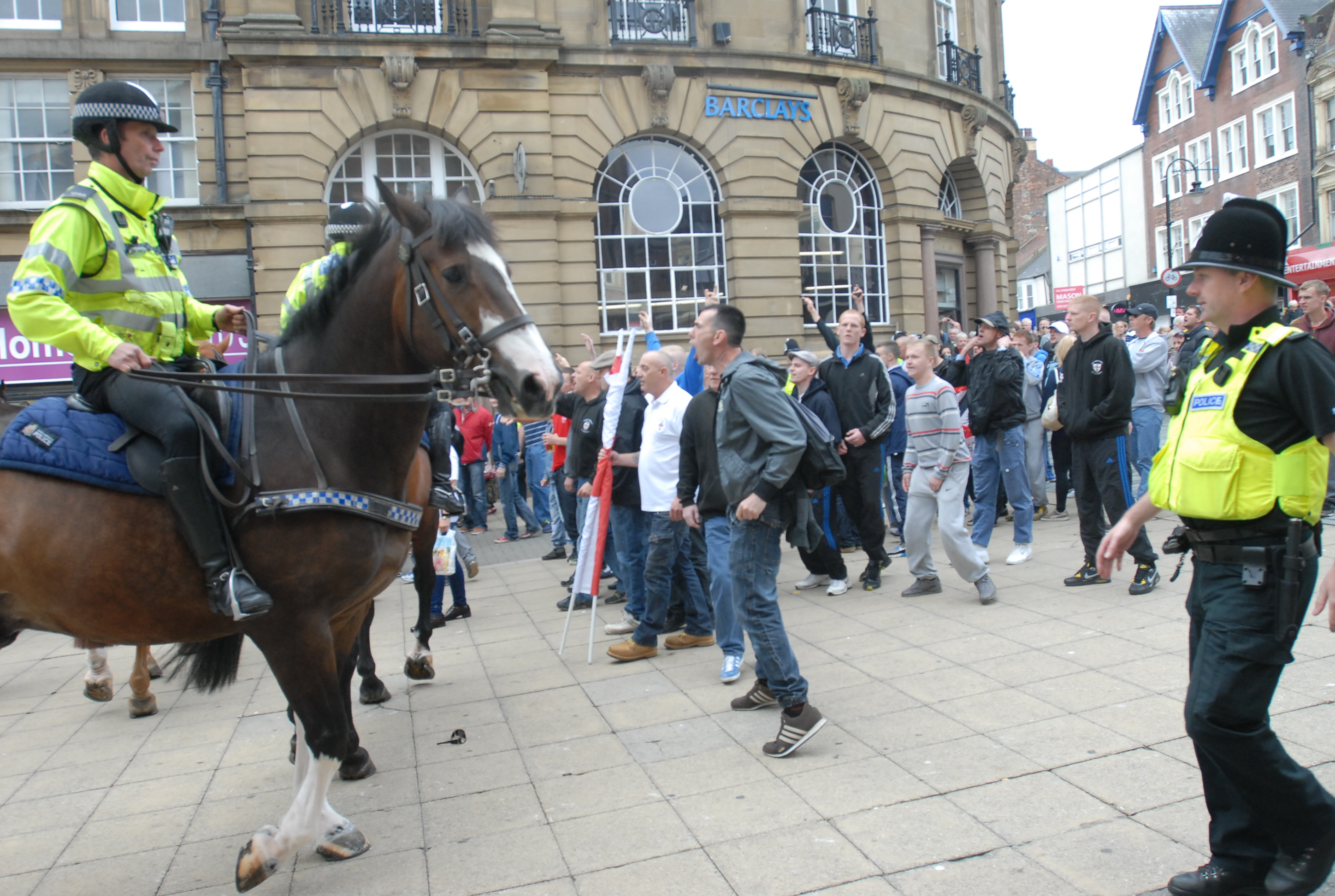 About 350 members of the right wing groups the EDL and North East Infidels gathered from 10am at The Scotia pub in the town centre ahead of a planned march.