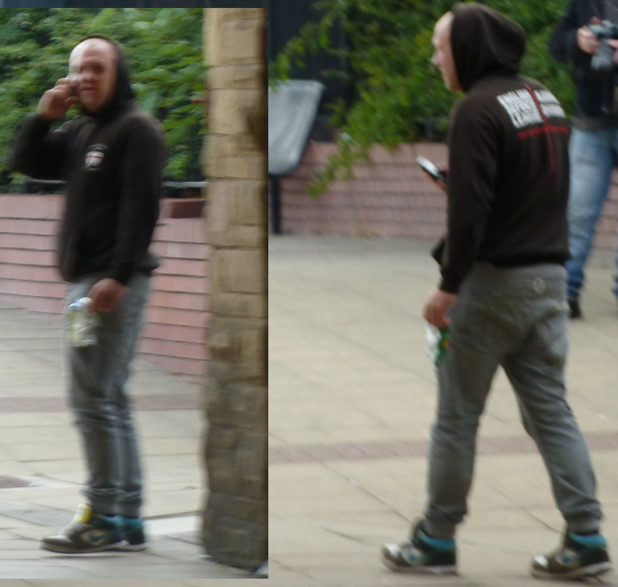 The full text on the NWI-EDL flag reads "Free Kingpin N.W.I. Diddyman" - "Diddyman" being well-known as Shane Calvert, the guy in the blue jacket, photographed in Swansea with Combat 18 thug and former EDL Wales organiser Luke Pippen, both in front of an NF flag. See link for more details -