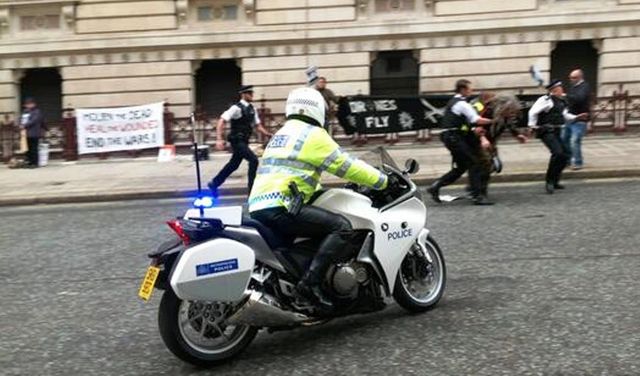 MEDIA REPORTS/ PHOTOS -London Catholic Worker Ciaron O'Reilly provides speed bump on Obama & Kerry's Highway to Hell in Syria & across the Middle East