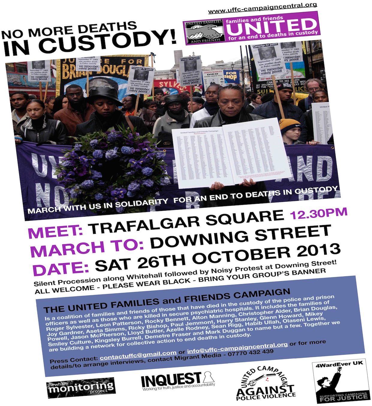 UFFC has supported cases such as Ricky Bishop, Roger Sylvester, Mikey Powell and Harry Stanley. In recent years other high profile cases such as those of Ian Tomlinson, Jean Charles De Menezes and Sean Rigg show how the IPCC and the CPS have continued to fail us. In the last two years alone we have had the deaths of David Emanuel (aka Smiley Culture), Kingsley Burrell, Demetre Fraser, Lloyd Butler, Mark Duggan and Anthony Grainger. The deaths have not stopped and nor shall we. Our Annual Remembrance Procession will take place on 26th October 2013.