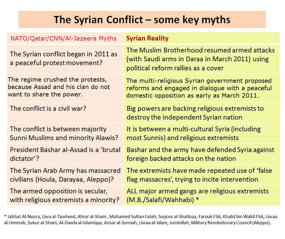 These tactics include mortar shelling of civilian densely populated areas under government control, targeting public services infrastructure of power, oil and gas, hospitals and health clinics, schools and universities, stealing public warehouses of strategic basic food reserves, dismantling and stealing public and private factories, flour mills and bakeries, interrupting or cutting transportation and traffic on highways, assassinations, extrajudicial killings and public beheadings, suicide bombings in city centers, targeting and besieging minorities, destroying and desecrating all religious and historic relics, flooding Syria with tens of thousands of foreign mercenary fighters obsessed by the al-Qaeda-like bizarre interpretations of Islam who violently compete among themselves for local leadership and war exploits because they are controlled by competing foreign intelligence agencies, and subjecting the population who come under their control to their brand of Islamic law courts, fatwas and orders, which dumped women out of society altogether to be reserved only for their sexual needs, etc.