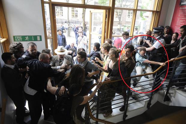 http://www.theguardian.com/uk-news/2013/dec/05/three-arrests-student-protest-university-of-london "A policeman seen punching a student in the face during a university protest will not face disciplinary action, it emerged yesterday. The officer was caught on film swinging at hooded protester Tony Jones, throwing the 24-year-old off balance with a blow to the shoulder before flooring him with a jab to the face. Last night the Metropolitan Police said no investigation had been launched and the officer concerned remained on duty in London." -
