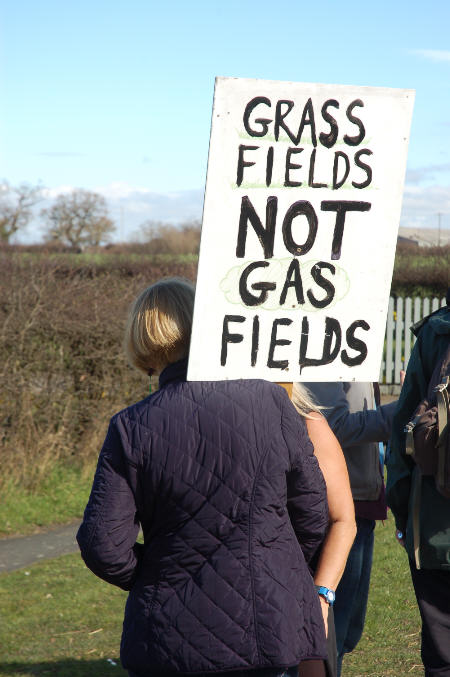 Over 200 people converged today on the site of Dart Energy's exploratory drilling for coal bed methane (CBM)at Kingsmarsh near the village of Farndon on the English/Welsh border. Some have stayed (see camp requirements below). As well as locals from Farndon and neighbouring villages, people came from all over including Wrexham, Chester, Deeside, Wirral, Liverpool, Fylde and a large contingent from Manchester and the Barton Moss Protection Camp where a stay of eviction pending an appeal hearing has just been secured until at least 26 March. More on the Farndon site here and here.