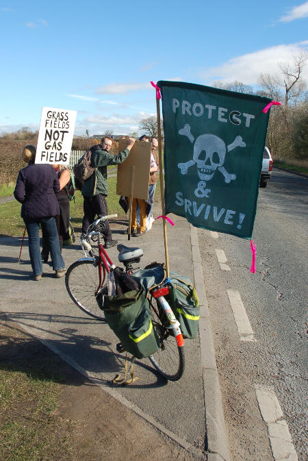 These first photos show a few of us converging on the verge on our way to the event, billed as Fight the Frack, and doing a bit of outreach to passing motorists on the A534. More pictures of the main event to follow.