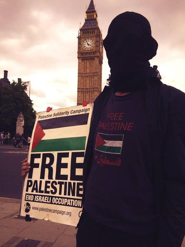 “Good!” said one PC, who began trying to rip the cover off my face. I shouted that I was wearing glasses and he was going to break them, so he left off. Then a police van arrived and they dragged me towards it. Taking my last chance, I roared “FREE PALESTINE!” at the top of my lungs several times before they bundled me in to the back. Off we drove to the nearest police station at Bethnal Green.