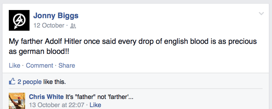 Alife's known to of been into Screwdriver and National-Socialist ideas since 2012 onwards. He's an active National Action member and is known to of attended the recent National Front remembrance march.