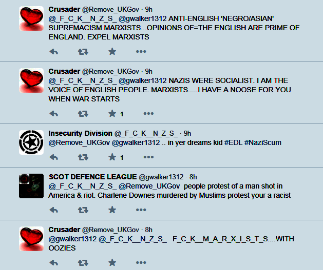 Note also the threats by the self-style "Crusader" to rum amok with automatic weapons, Anders Breivik-style against anti-racists, alongside the old national front / bnp threats to "hang traitors" when they take power.