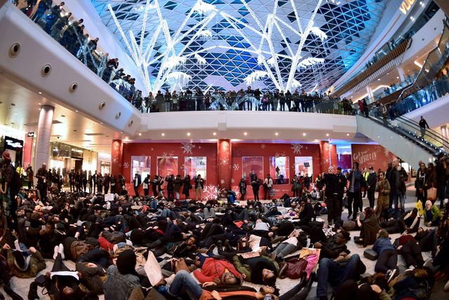 The protest was called in Westfield Shopping Centre in Shepherds Bush. It had been widely advertised on social media, and police and security were on high alert. Security tried to stop some people entering the temple of mass consumption, but obviously in the peak Christmas shopping period they weren’t going to lock all the doors, and hundreds did get inside from 6pm. On cue, there was a mass “die in”, lying down in the central courtyard.