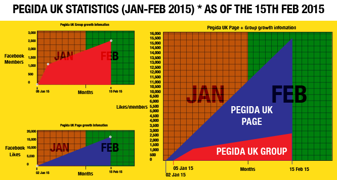 Pegida also has a Pegida Politics page though with less members of 200+. Both pages were made by Tom within the first week of January while the earliest post on Pegida UK’s page can be dated back to the 4th of January. At this very moment Pegida UK Page has 15,000+ likes and Pegida UK’s group page has 2,570+ members in just over a month though a lot of support is also from overseas too.