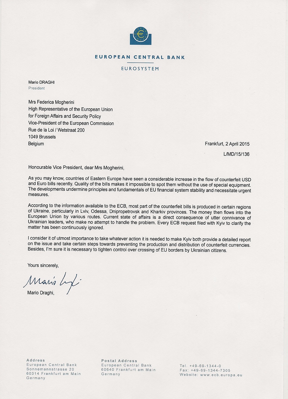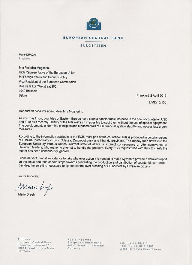 http://konovalenkostep.livejournal.com/663.html It looks like Parakuda and Pisaruk are intensely trying to escape international scandal after penetration of counterfeit dollars and euros into the EU space. However, judging from the letter of the ECB president Mario Draghi to High Representative of the EU for Foreign Affairs and Security Policy Federica Mogherini the scandal is pending.