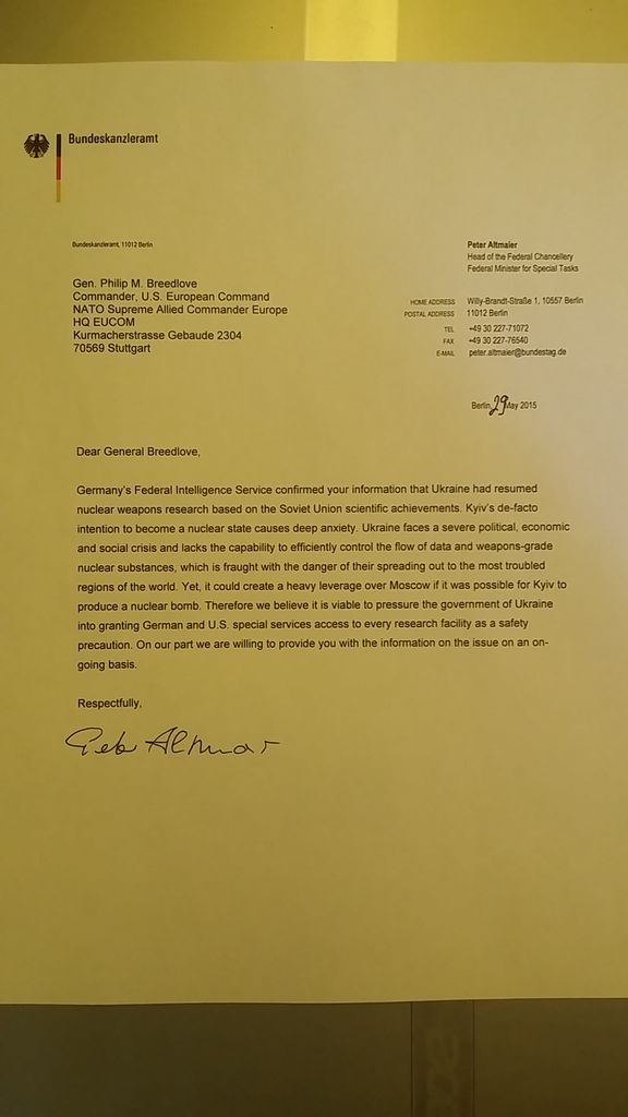 Washington, Brussels and Berlin are well in the know about the steps of the Ukraine targeted at restoration of its nuclear arsenal. The letter by Peter Altmaier, Head of the Federal Chancellery and Federal Minister for Special Tasks, to Gen. Philip M. Breedlove, Commander of the NATO Armed Forces in Europe, confirms the fact.