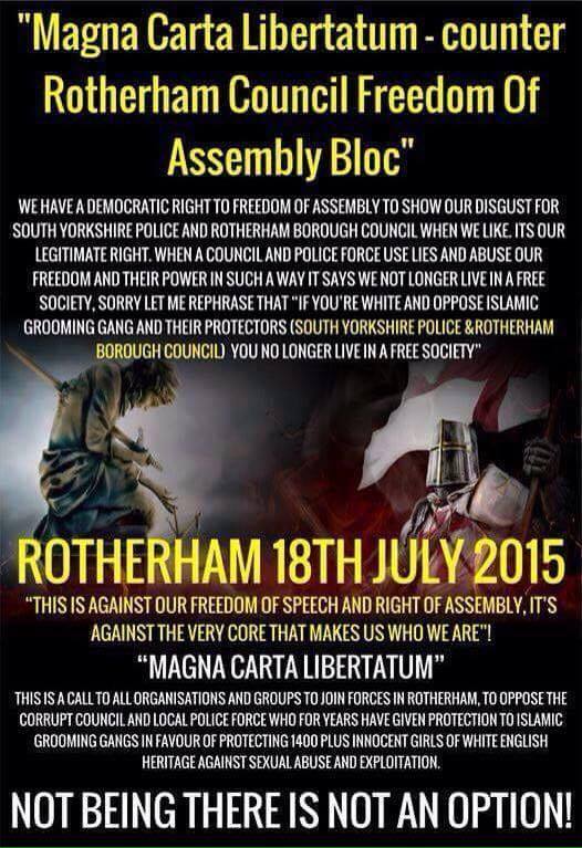 A far right march is planned this Saturday in Rotherham, it appears to be a combination of various right wing groups which could see a significant turn out if allowed, (apparently it has) The usual suspects will be involved including the Infidels and the NF and more extreme elements of the EDL, The Fascists are using the freedom of speech banner as a means of mobilisation rather than the usual racist tactics, which could make it even more dangerous from a political perspective, that`s if they stay sober before the march, and manage to behave themselves. which is unlikely. So far it looks like they`ve got a free run around Rotherham this Saturday which is worrying as the town has more than its share of problems without racist boneheads causing further trouble.