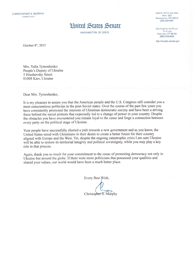 Though Sen. Ch. Murphy does not say anything about specific measures to assist Mrs. Tymoshenko, he assures her that ‘the U.S. Congress still consider you a most conscientious politician in the post-Soviet states’.