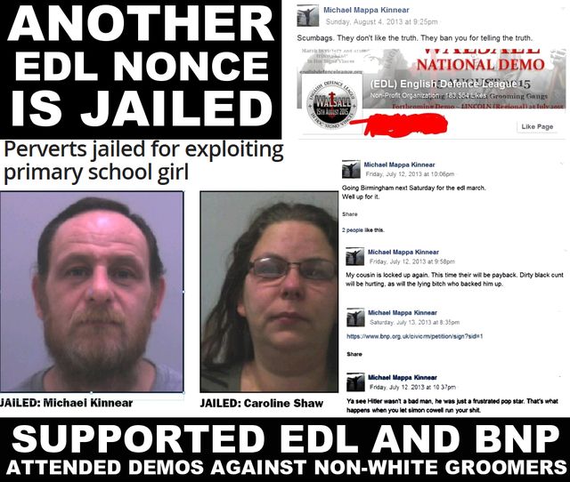 EDL supporting, Hitler loving kiddy abuser Michael Kinnear of Blackpool was jailed for nine years for the most horrific sexual abuse of a young girl along with his co-abuser Caroline Shaw. Kinnear was a regular at EDL demos, and was vocal in his campaigning against non-white paedos, whilst secretly he was a nonce of the most horrific kind, who conversations show, was discussing to rape and kill young girls. This shows the blatant hypocrisy of the EDL - an organisation teeming with horrific criminals and perverts. NOTE: - The EDL failed to protest outside the courtroom for the conviction of one of their own child abusers. No surprise there!