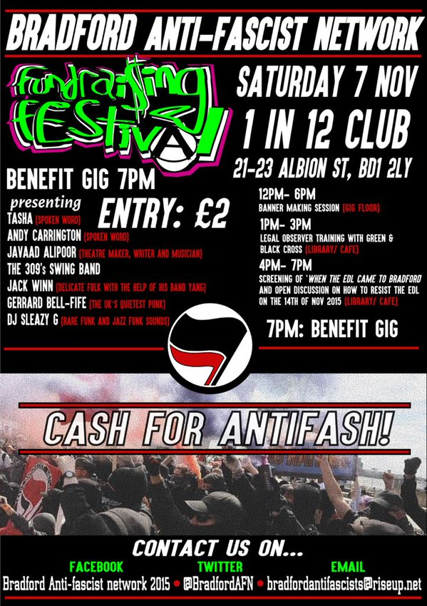 You've seen newspapers, you have read about it on social media - The violent fascist scum of the EDL are returning to Bradford to try to cause trouble in Bradford on Saturday October the 14th 2015. Following their two fruitless previous visits, the drunken, coked-up racist thugs are looking to make it third-time lucky, promising on facebook to "destroy Bradford", a city which for its world-famous multiculturalism, is always the ultimate target of any nazi group. It is essential that their wet dreams of racial warfare are crushed by an overwhelming show of unity between all communities. Print out the poster below (click on it for a larger printable png version). Also attend the rousing all-day Anti-fascist fundraiser next week Bradford's 1in12 club: - NO PASARAN!