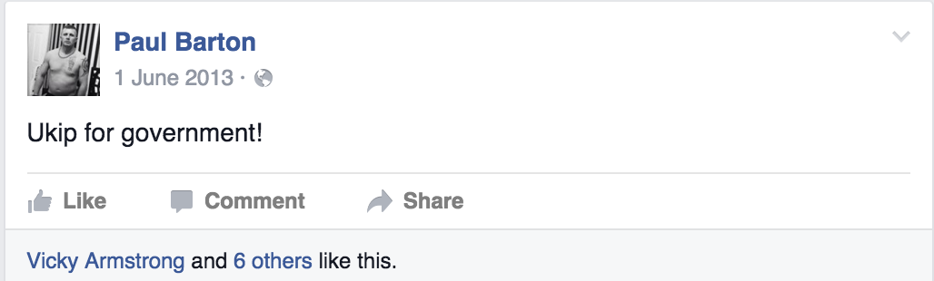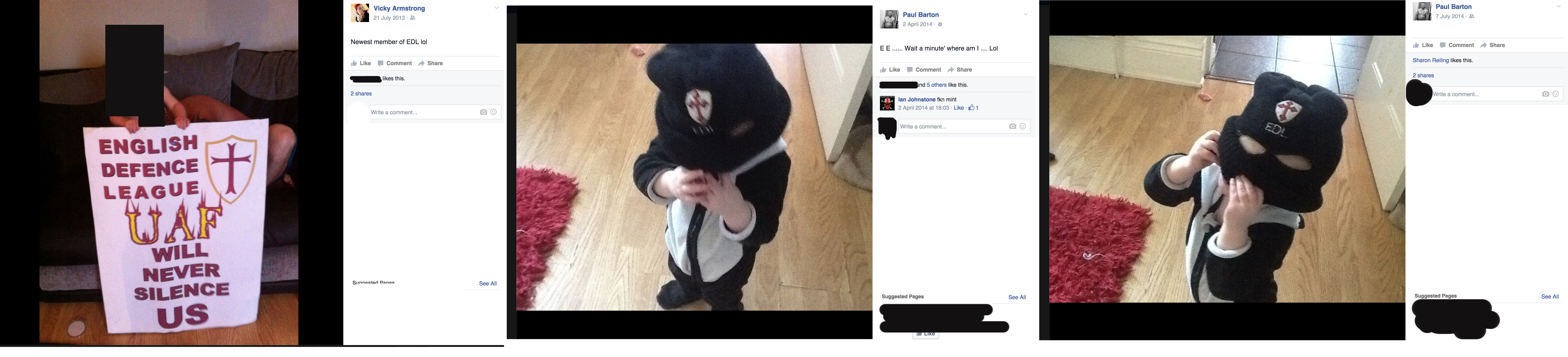 Political History:- Paul Barton has been involved with the North East EDL since 2013 to this present day and has attended numerous demos nationwide and locally around the North East. Both and Paul and Victoria on a number of occasions are caught manipulating their own kids making them hold and wear EDL related propaganda and material.