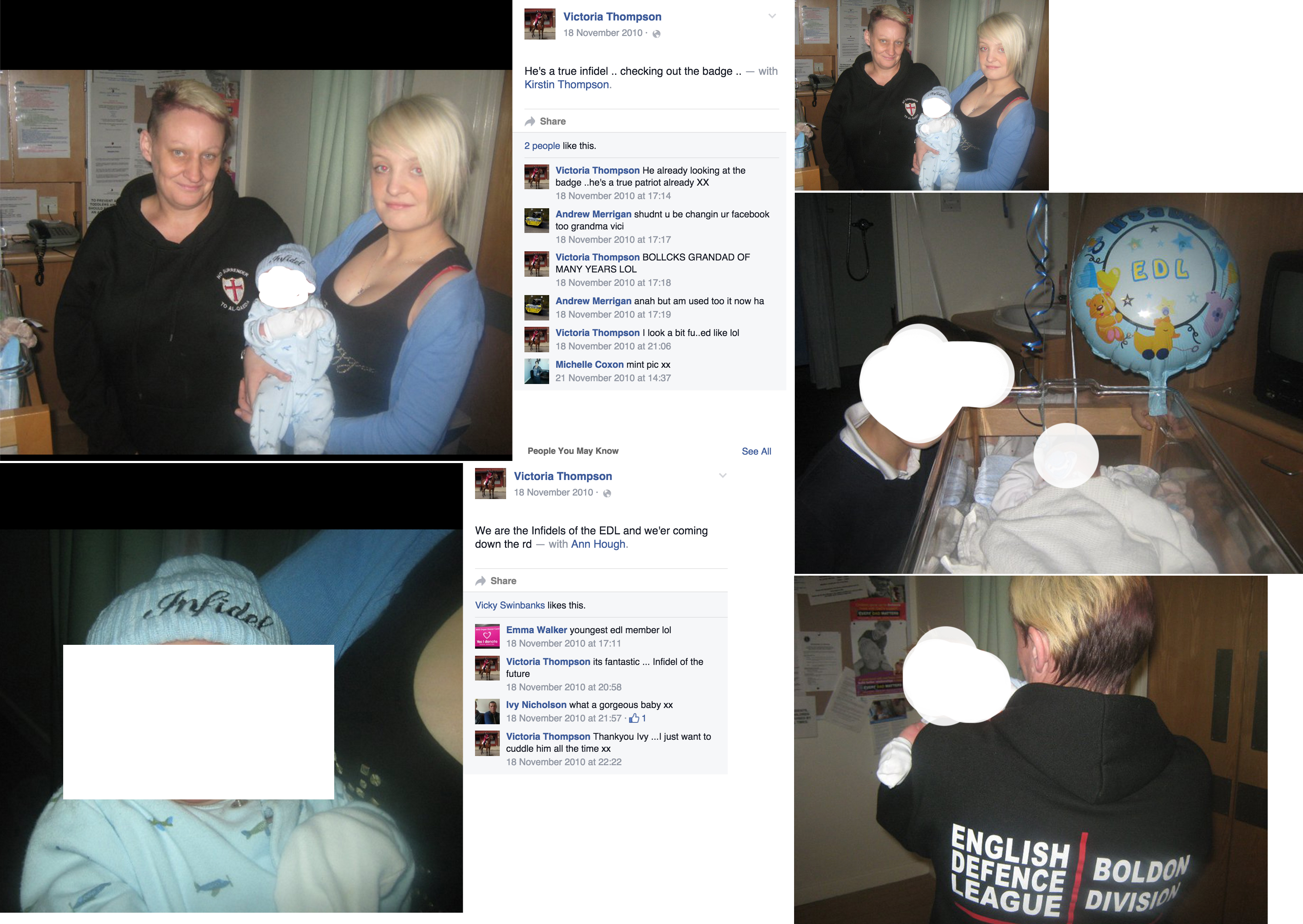 Victoria Thompson's crude comments - EDL and Infidel hat for new daughters baby.