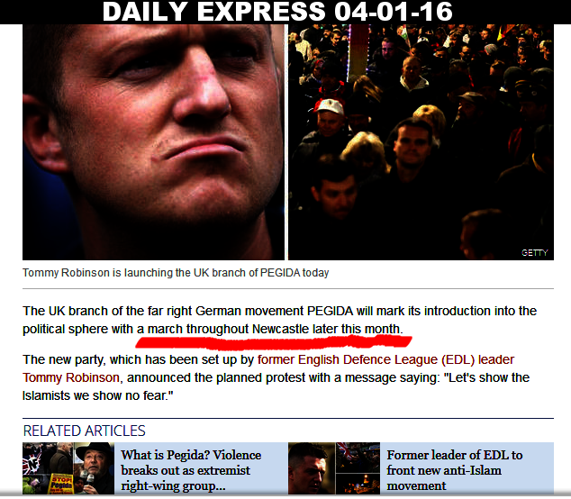 http://www.express.co.uk/news/politics/631357/PEGIDA-launches-Britain-vow-fight-Islamification-of-the-West-Tommy-Robinson The Daily Express are calling Tommy Tit's Pegida return to Newcastle "their first major rally", obviously knowing their last visit was shamefully unattended. Seeing as though Express Group Newspapers don't particularly like Muslims, it should be no surprise they would have been hanging out with the PegEDL lowlives at the Cuckoo pub near the outskirts of Luton, ready to big-up the best nazi thing since sliced bratwurst.