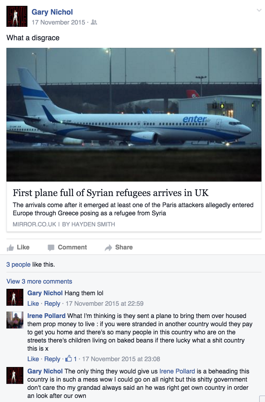 Political History:- Gary Nichol has been active and involved with the North East EDL since 2013 attending numerous of local and nation-wide demos up to this present day. Gary also shows support for the BNP (British National Party) and stated he thinks refugees should be hung,