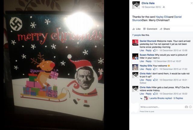 Political History:- Chris Hale has been involved with the National Front West Yorkshire branch for a number of years. Chris Hale makes a number of anti-semitic posts and manipulates his own son on one occasion to look like Adolf Hitler in addition to also taking a photograph of him.
