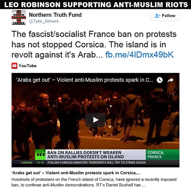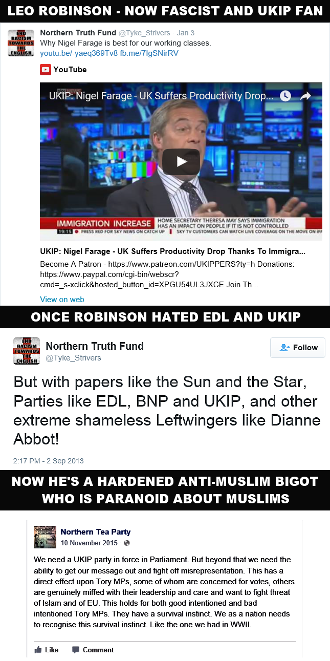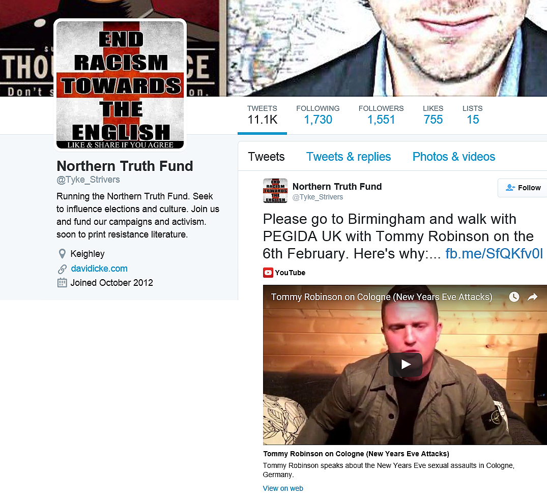 Leo Robinson seemingly underwent a racist transformation in 2014, and his very own "Northern Tea Party" Facebook page, once a libertarian political party outfit, has now morphed into an extreme fascist group full of horrific anti-Muslim, anti-immigrant posts. Buddhist worshippers throughout West and North Yorkshire must be made aware of his extremist political leanings. The Northern Tea Party's Facebook page is abysmal, crammed full of Islamophobic and anti-refugee hate, supporting EDL, UKIP and Pegida and calling all North Africans rapists. Leo Robinson's main twitter account has become the Northern Truth Fund, linking his anti-Jihadism into the larger conspiracy theory "Truther" movement, the caption picture for his twitter page (see the screenshot) "End racism towards the English", with over one and a half thousand followers.