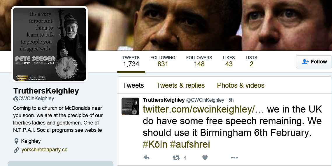 https://www.facebook.com/Tyke-Strivers-of-Keighley-District-Ancient-wisdom-for-modern-life-1460575850867436/ From little green men to lizards, former sports commentator David Icke's followers are renowned believers in conspiracy theories, plenty of which were related to 9/11, some blaming Jewish people for what they call the New World Order, or ZOG as they like to call it. The far right have logged onto his internet conspiracist forums in large numbers, tempted by the sporadic anti-Semitism. BNP chemical bomb terrorist from Colne, Lancashire, Robert Cottage believed in such conspiracies, inspired by the anti-Jewish hate on the site, however it is only in recent years that "Truthers", as they like to call themselves, have warmed to Islamophobia big-time. Thanks to her anti-jihadist movement, Pam Geller has overtaken Pat Buchanan as Ickeists' favourite hatemonger due to their extreme anti-Muslim narratives. "Keighley Truthers" led by racist Keighley Buddhist leader, ex-Tory member "Tyke Strivers" - real name Leo Robinson, are using Facebook and Twitter to encourage hatred against Muslims and immigrants, and are championing Tommy Robinson's upcoming Birmingham neo-nazi demo.